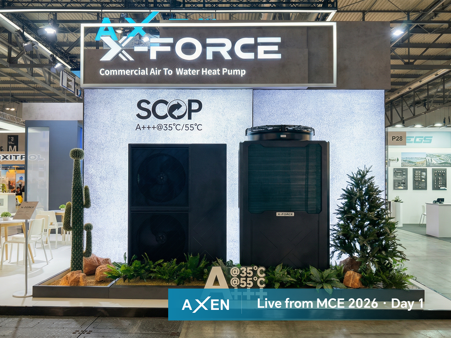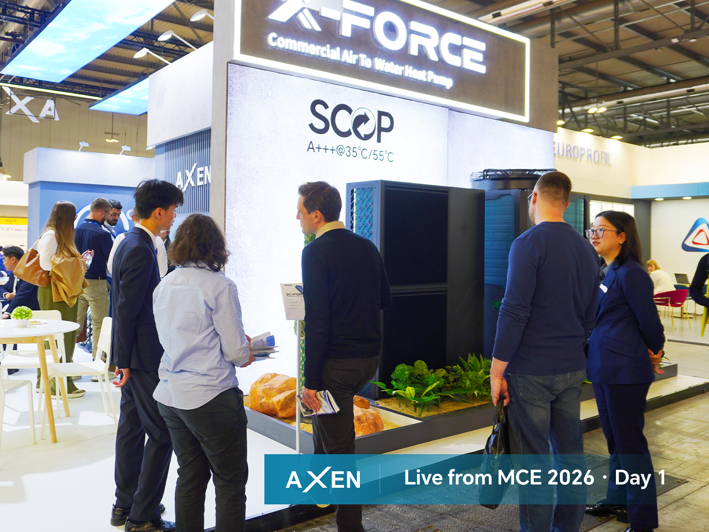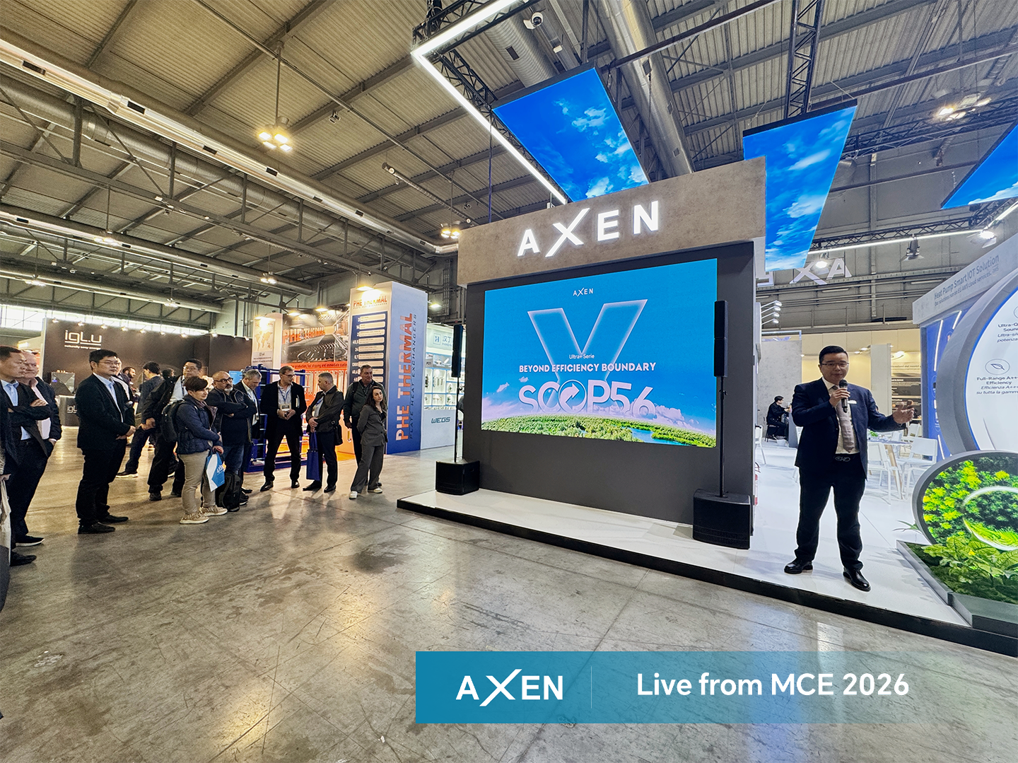 3月25日,AXEN在MCE现场正式发布了全新一代高性能热泵产品——Ultra+。继2023年在ISH发布Ultra系列之后,AXEN历时三年潜心打磨,推出这一全面升级之作。该产品达成了史无前例的5.6 SCOP能效比——这一数据已通过欧洲权威认证机构TÜV的严苛检测与认证,突破能效边界,与本届展会核心口号“Beyond Efficiency Boundary(超越能效边界)”高度契合。
